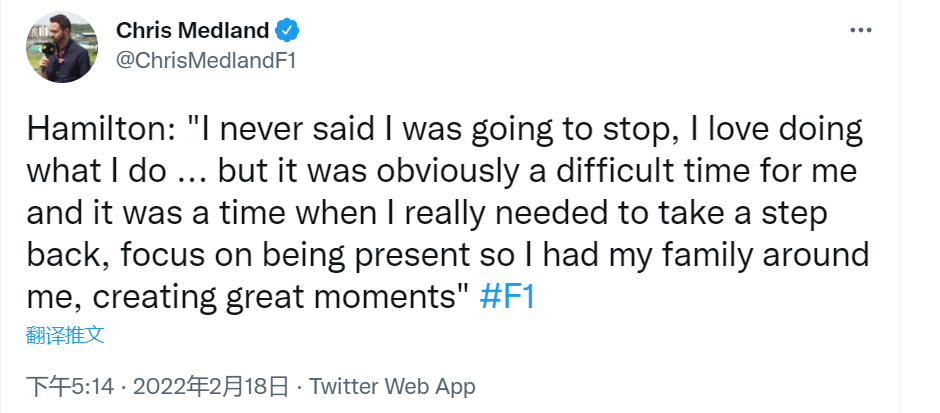 汉密尔顿的回答没有破绽,他说:“我从来没有说过我会退役,我喜欢做我热爱的事。阿布扎比站,这显然对我是艰难的时期。那我需要稍微远离(大众),专注于自身。还好我有家人陪在我身边,他们给我带来了美好。”