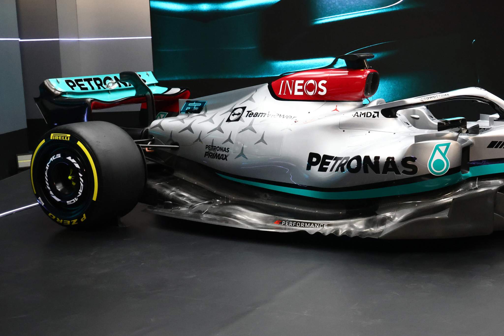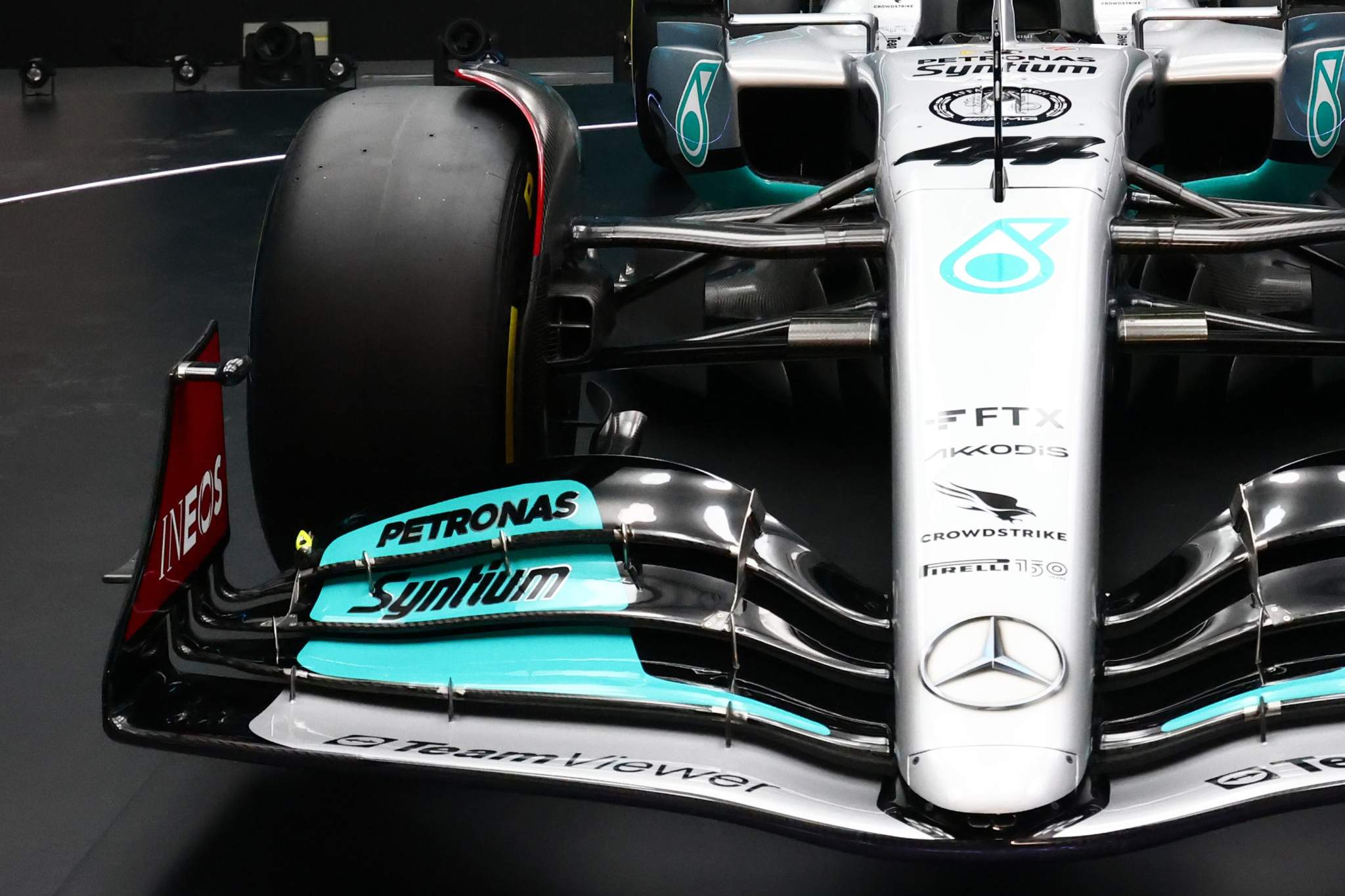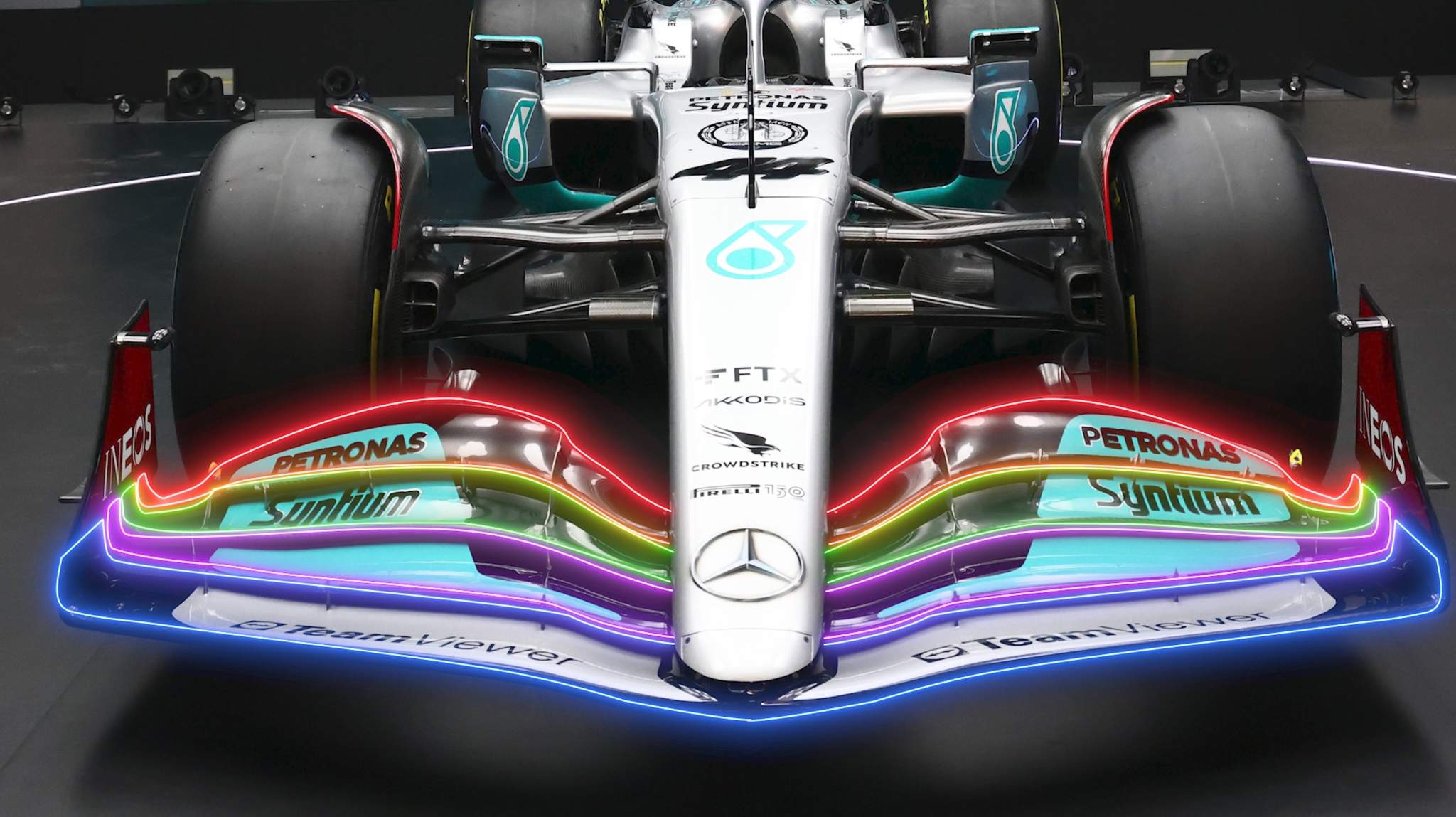 梅赛德斯制作的渲染图与实际发布的汽车有很大不同。而在本篇分析中,我们将基于实车,也就是在银石赛道上奔驰的那辆。