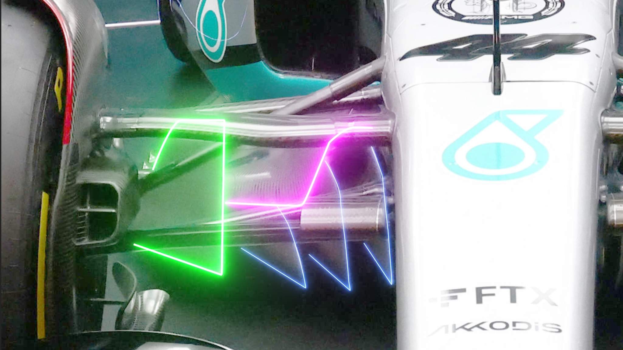 这与法拉利的设计大不相同。梅赛德斯前翼内部的负荷不高,让受到较少干扰的气流从底盘下方进入底板前缘。受规则要求,前翼跨中加载,并在端板处减弱。翼片后部三分之二的部分可以活动,通过小角度变化进行赛车平衡调整。端板向上弯曲,将气流导向前轮外侧。