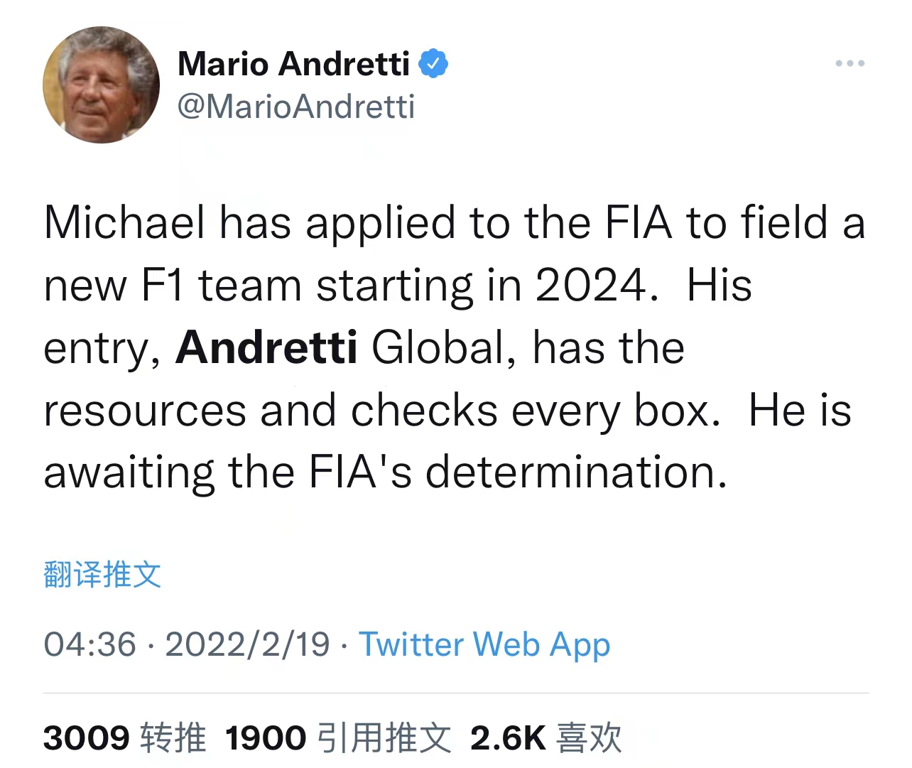 59岁的迈克尔是1978年F1世界冠军马里奥·安德雷蒂(Mario Andretti)的儿子。老安德雷蒂周五在社交媒体上证实了这一消息,他在推特上表示,他的儿子“拥有足够的资源,能通过所有审查”。