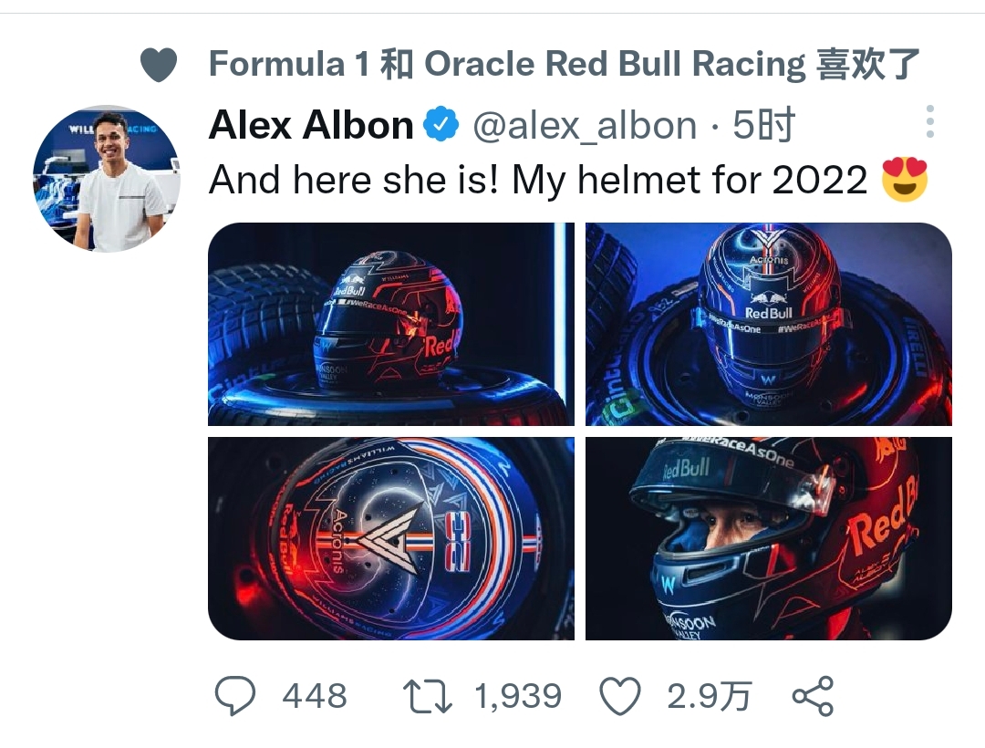 阿尔本更新了twitter上,展示了自己的新头盔。