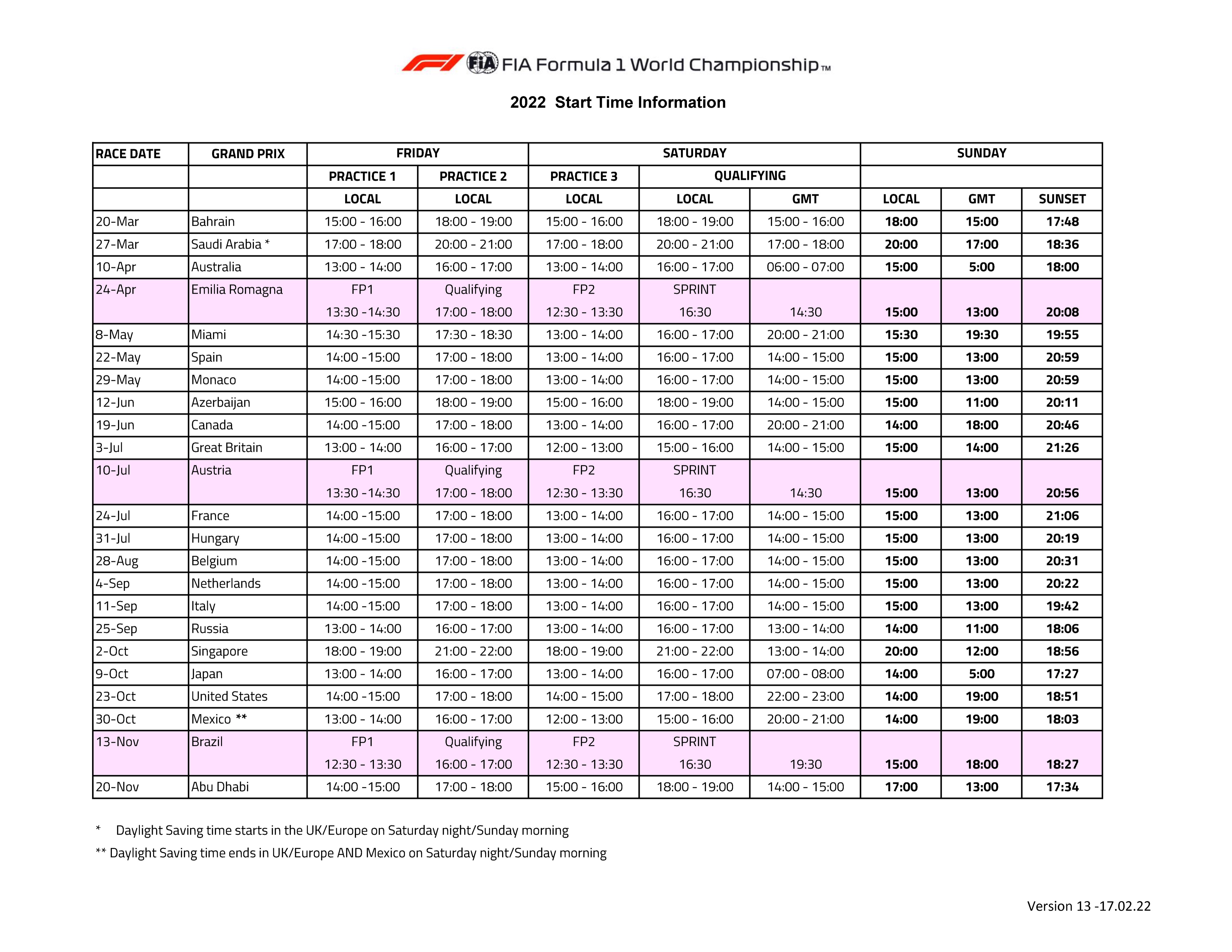 F1更新了时间表,其中加上了艾米利亚-罗马涅站、奥地利站和巴西站的冲刺赛。