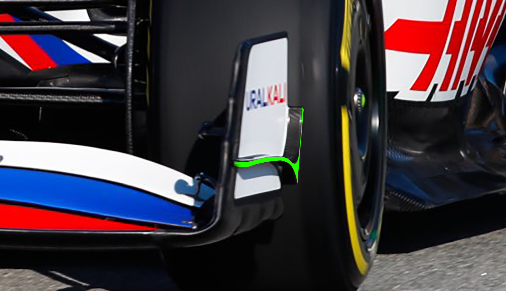 前翼的前两个翼片中间有一个缝隙,虽然哈斯处理翼片的方式和法拉利相同,但哈斯VF-22赛车在这个区域拥有的可调整襟翼较长,所以哈斯有更大的空间去调整赛车平衡。