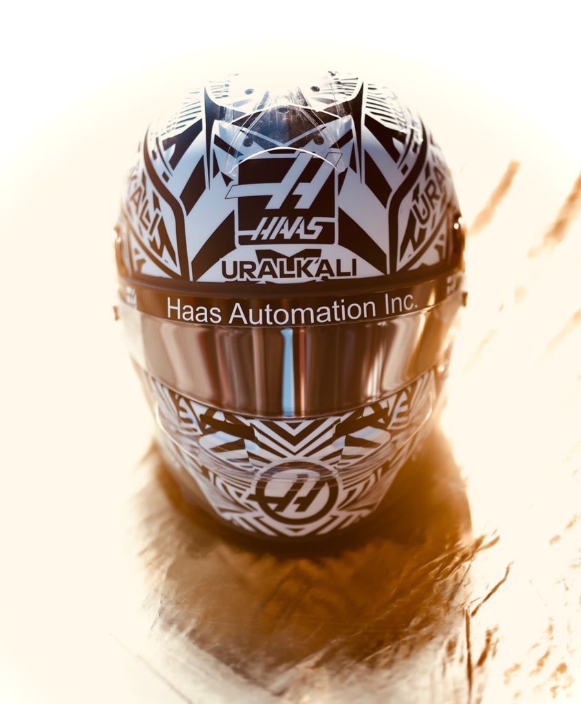 哈斯车队在社交媒体上分享了两张马泽平将在冬测使用头盔的照片,整个头盔以黑白为主,类似斑马的条纹。