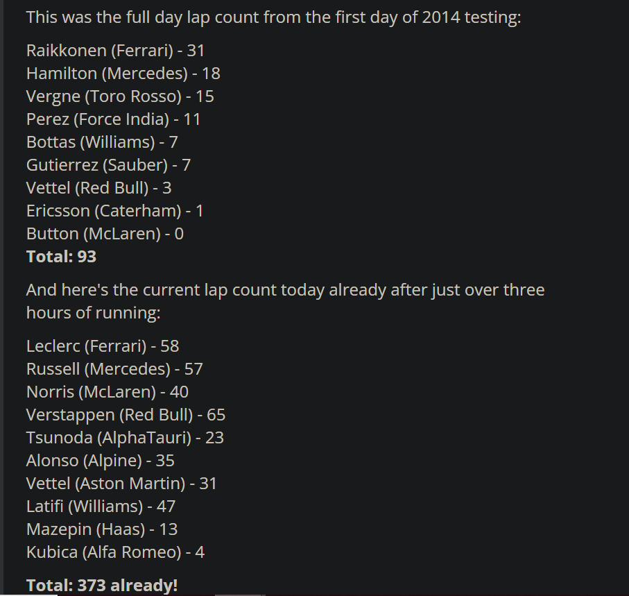 对比2014的首日测试,各支车队第一天一共只跑了93圈。