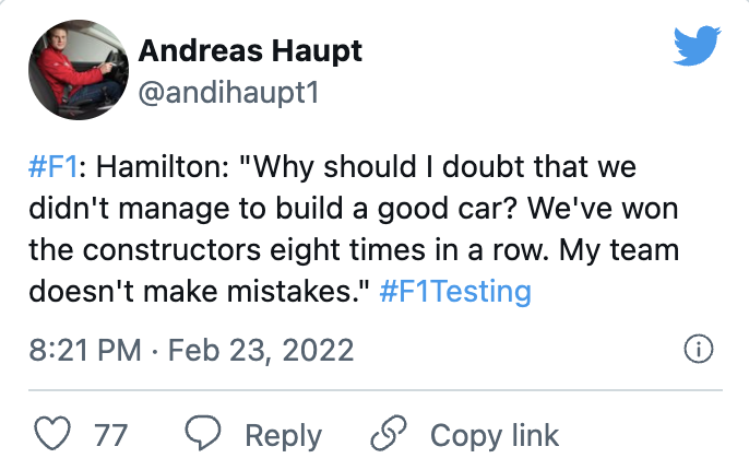 汉密尔顿在首场发布会上说:“为什么我要怀疑车队没造好车呢?我们已经连续获得了8次制造商总冠军,我们车队不会犯错。”
