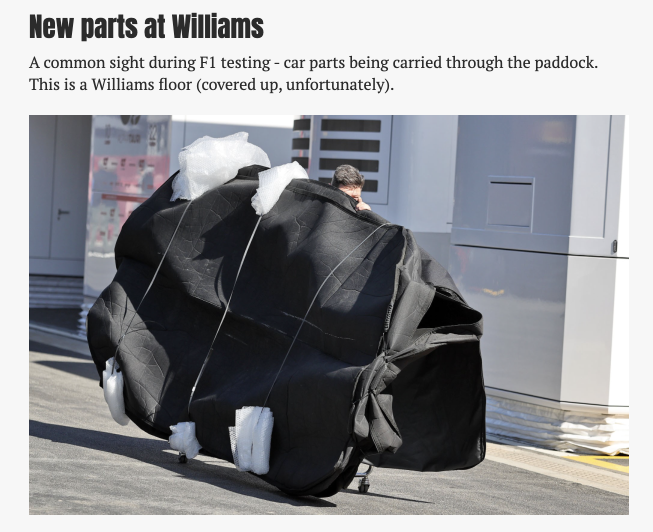 围场内拍摄到威廉姆斯工作人员也在推着被包着的新底板。看来不止一家车队有着不同的准备。