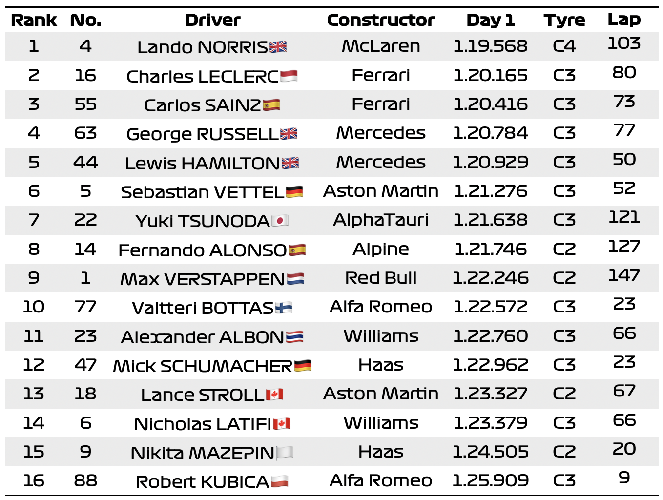 F1巴塞罗那冬测首日成绩揭晓,迈凯伦车队的诺里斯以1分19秒568取得最快,法拉利车队的勒克莱尔和塞恩斯紧随其后。里程方面,法拉利车队的两位车手共计完成了153圈的测试,是所有车队中里程数最多的车队。