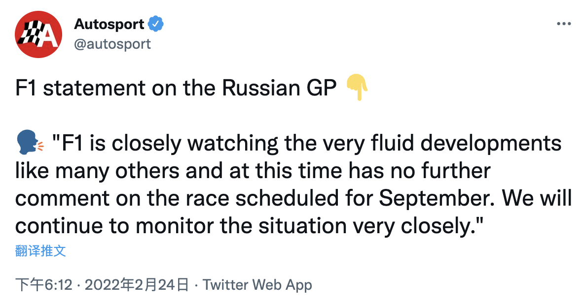 F1发表声明,称暂时不对原定9月份举行的俄罗斯大奖赛去留发表评论,但会密切关注动荡局势。