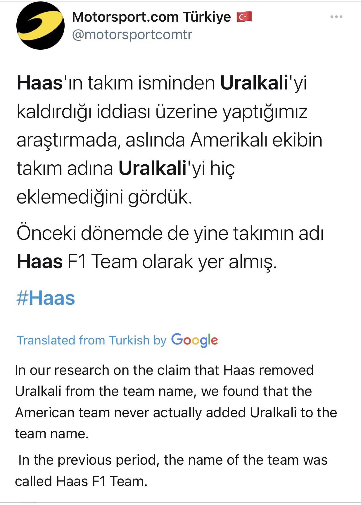 刚刚,知名赛车网站motorsport土耳其站辟谣,哈斯官方推特名称一直没有俄罗斯冠名商(URALKALI乌拉尔化学公司)。