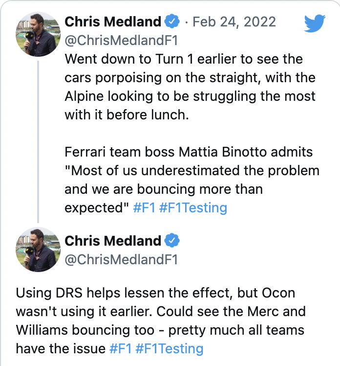 F1官网记者梅兰德表示,他今天专门在巴塞罗那的一号弯观察车队受颠动效应的影响,Alpine车队似乎是上下颠簸幅度最大的车队。包括梅赛德斯和威廉姆斯在内的几乎全部车队都面临着同样的颠动问题。