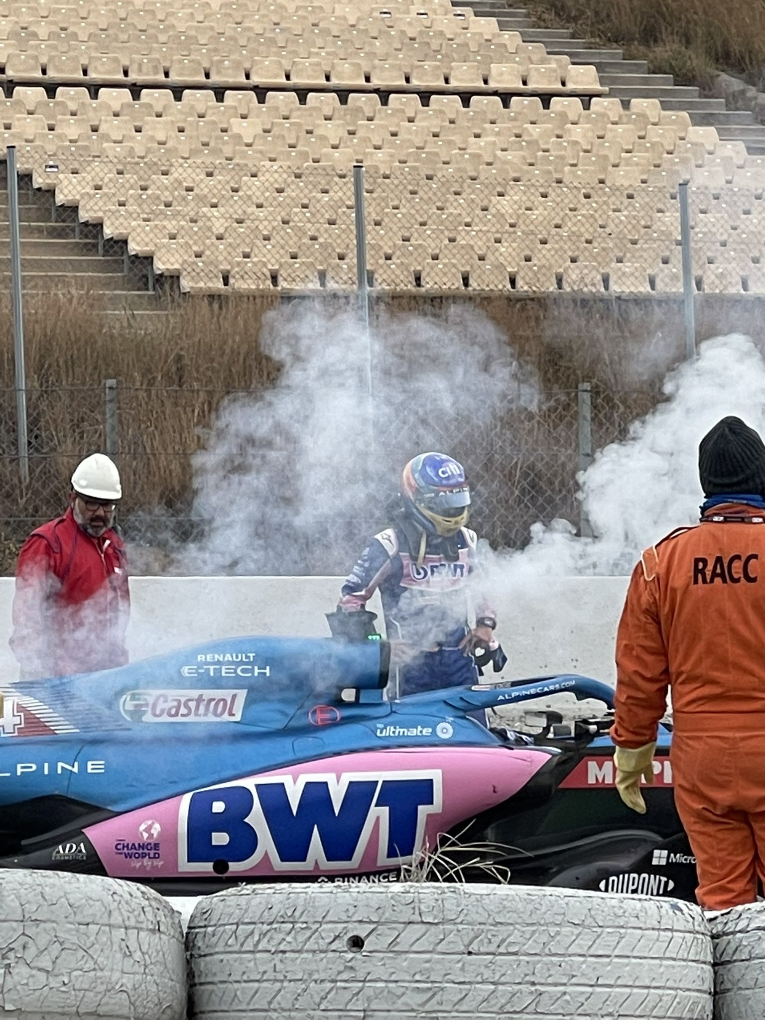 据说,车辆起火的原因是因为引擎爆缸。而车队表示是因为失压问题(并未说明是哪里失压),所以阿隆索在收到车队指示之后停下了赛车。