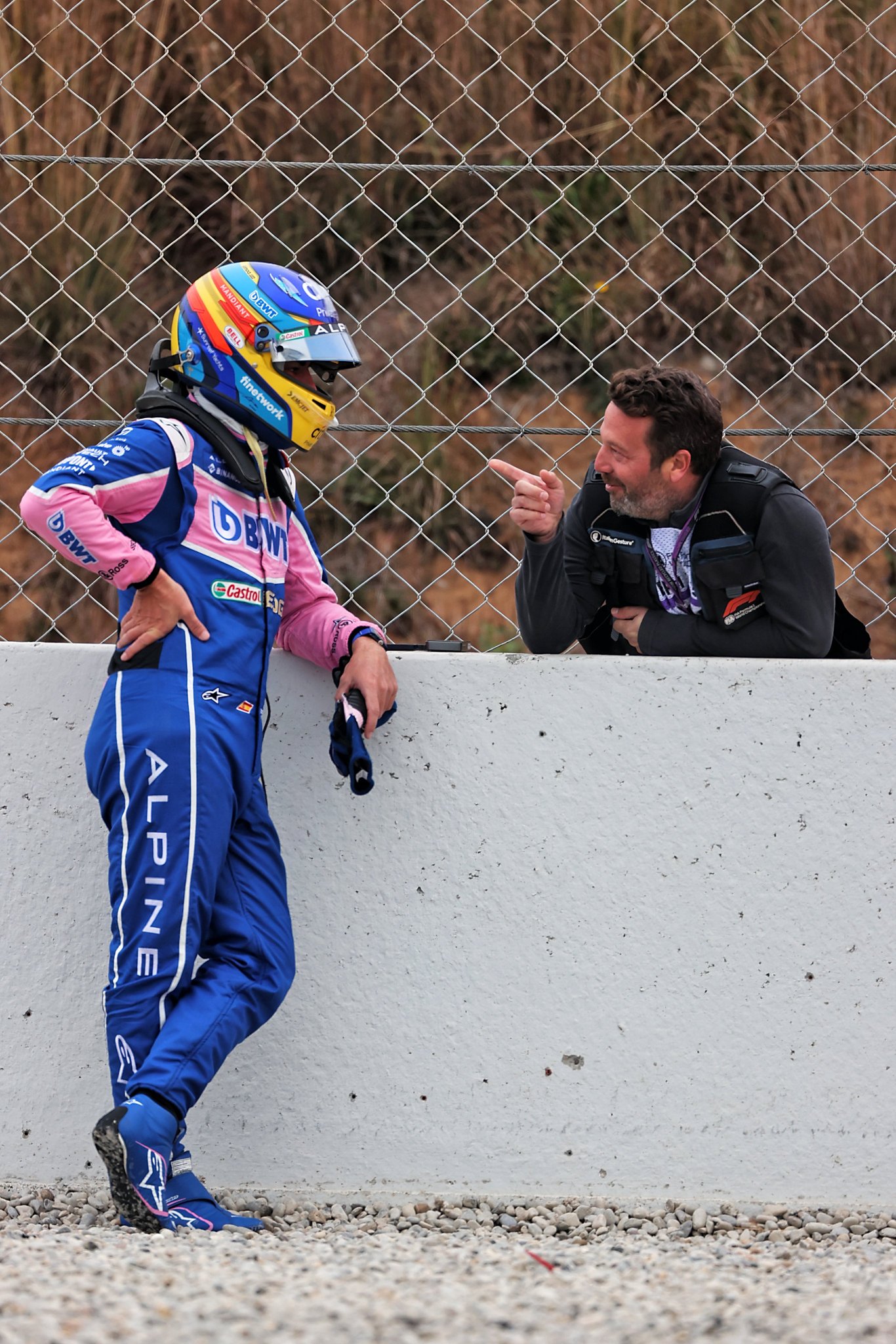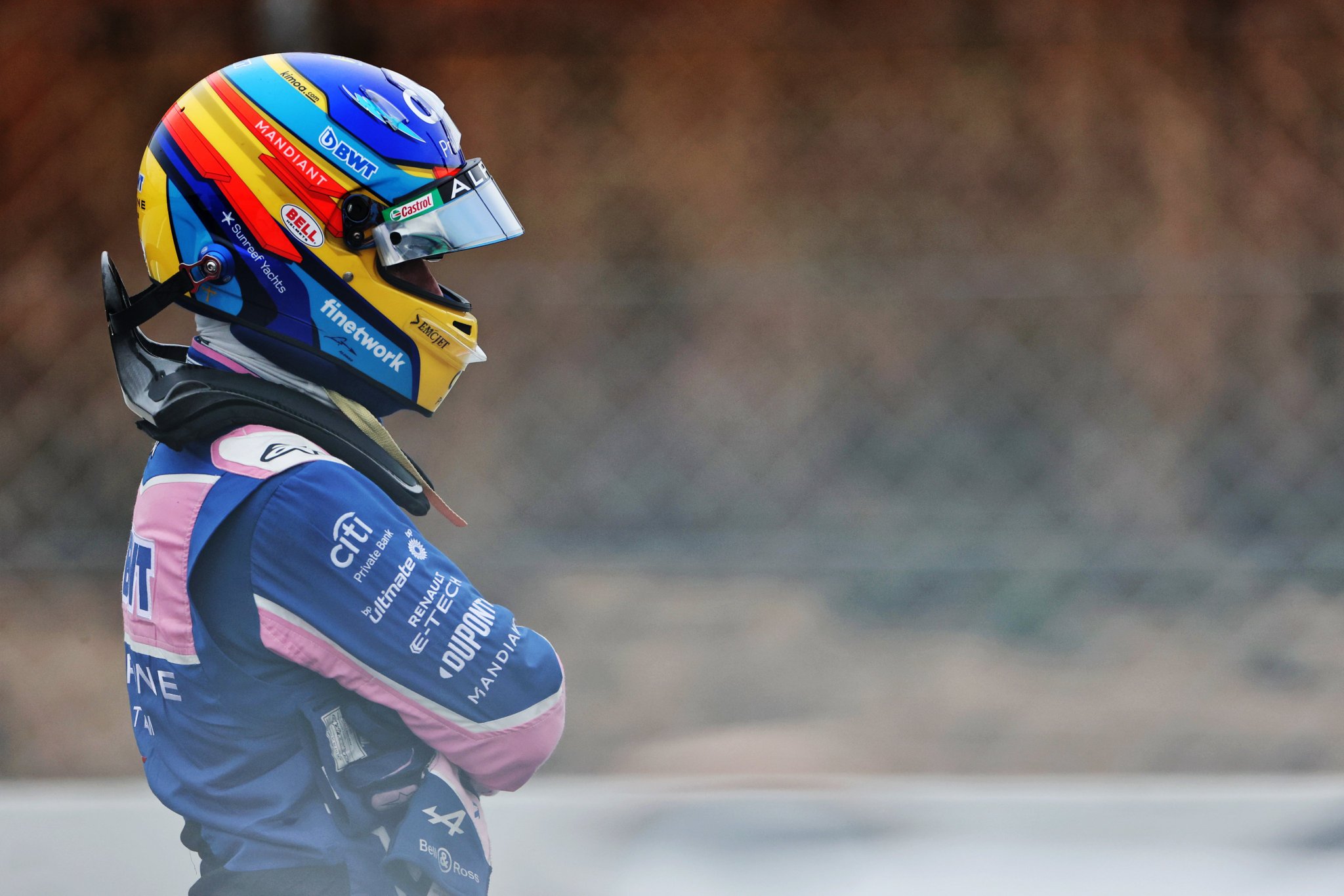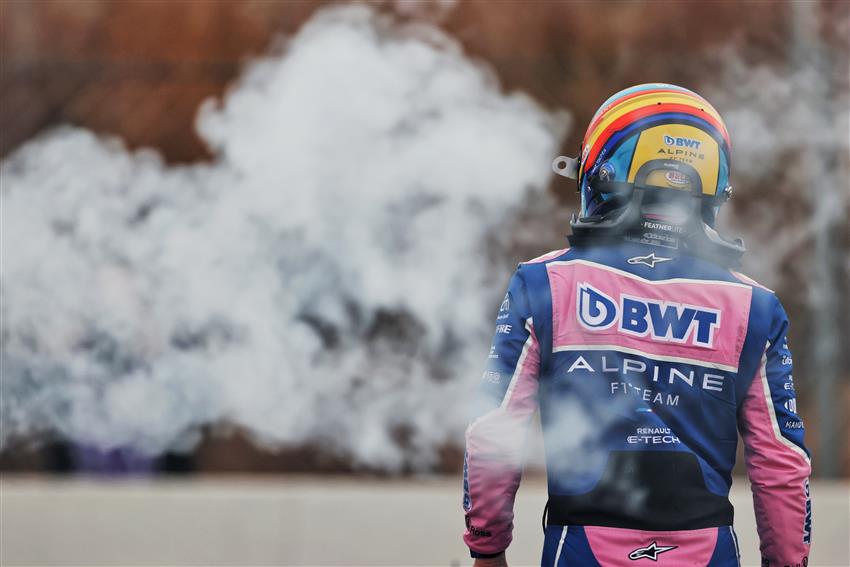 赛车着火之后,阿隆索只能在一旁无奈地抱手,看向自己的车。