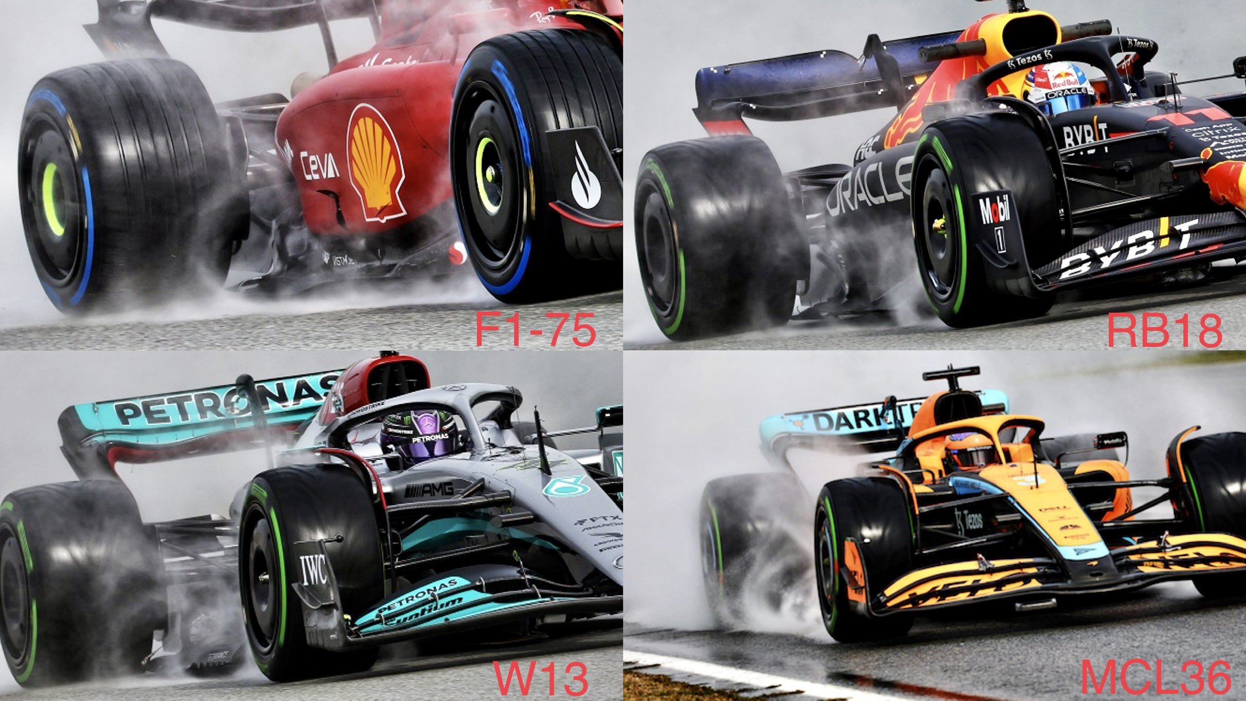 有网友贴出了在F1湿地测试中,能较为清晰地反映出车辆侧面气流流向地照片,其中包括法拉利、红牛、梅赛德斯和迈凯伦车队。这四支车队在第一次测试之后也被普遍认为是表现比较好的队伍。