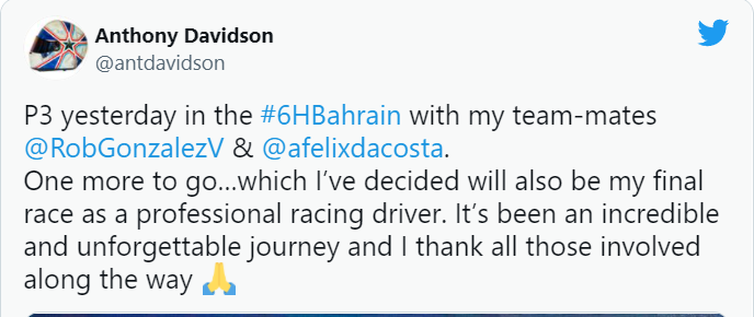 WEC世界冠军、天空体育解说员、前F1车手安东尼·戴维森昨日在个人推特账号上宣布退役,在下周WEC巴林8小时耐力赛后结束车手生涯。