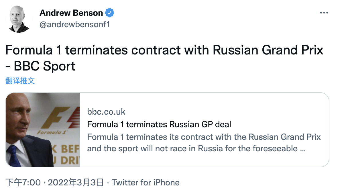 BBC的知名F1记者Andrew Benson:F1已经终止了和俄罗斯大奖赛的合约。