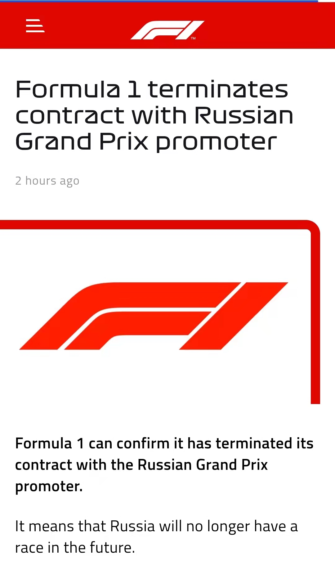F1官方宣布与俄罗斯大奖赛的合同终止。这意味着俄罗斯未来将不再举办F1比赛。