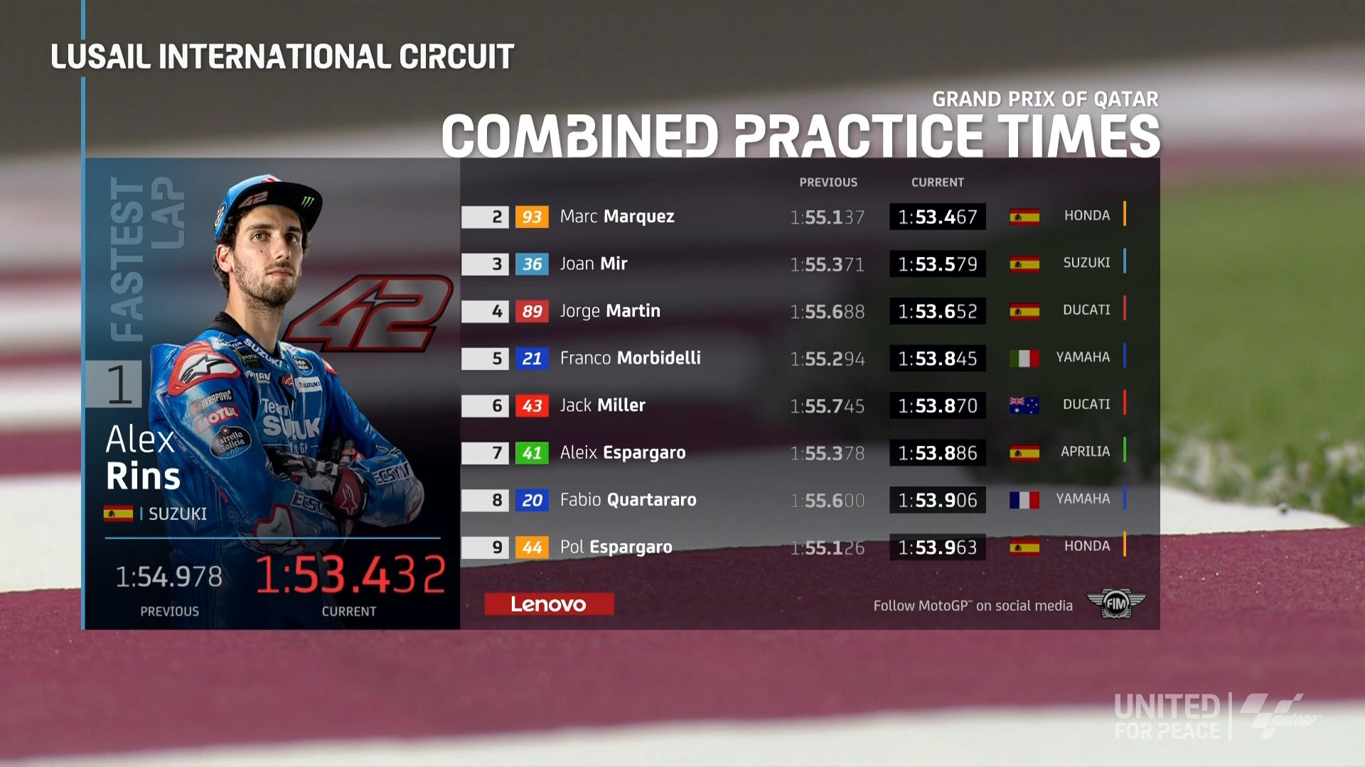在MotoGP卡塔尔揭幕战前两次测试后,铃木车手林斯和米尔分别排在一三,马奎斯排在第二,去年夺冠的夸塔拉罗位列第八。