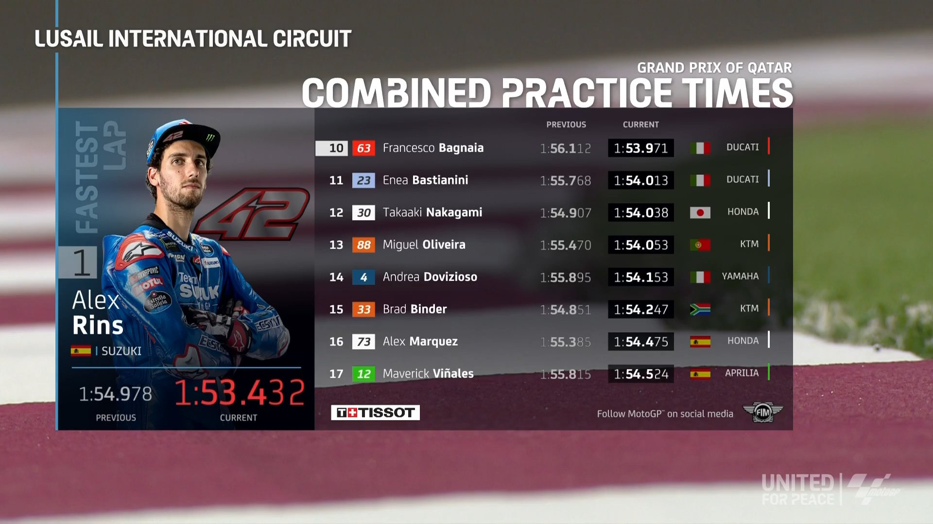 MotoGP周五练习赛综合成绩,前十只差半秒