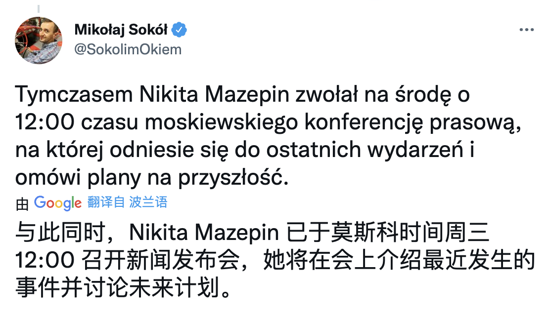据ELEVEN Sport的波兰F1记者Mikołaj Sokół报道,马泽平将于莫斯科时间周三12:00(北京时间3月9日17:00)召开新闻发布会,讨论一下最近发生的事情以及未来规划。