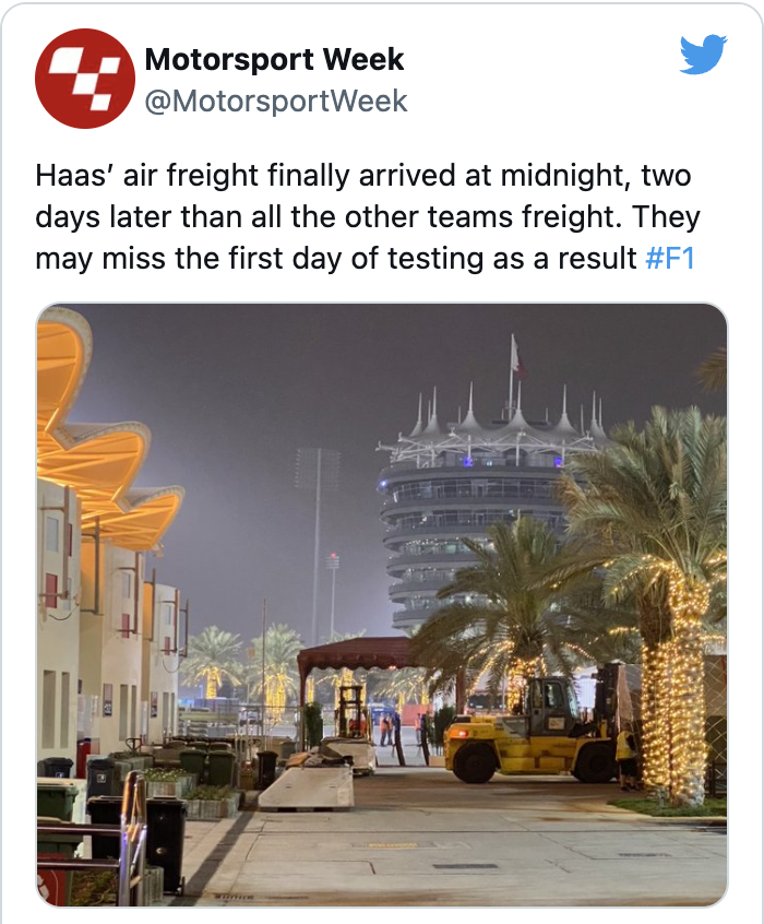 根据在巴林赛道现场的媒体报道,哈斯的空运货物在今天凌晨才刚刚抵达赛道,比其他车队的货物晚到了两天左右的时间。