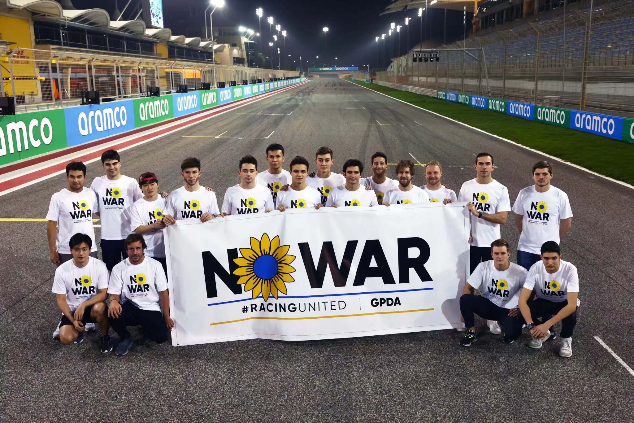 在巴林测试正式开始之前,18位F1车手手举反战旗帜抗议俄乌战争,除了汉密尔顿因航班延误以及刚刚官宣的马格努森其余车手均参加了合影。车手和车队的社交媒体也进行了转发,文案基本统一:与乌克兰人民站在一起,反对战争。
