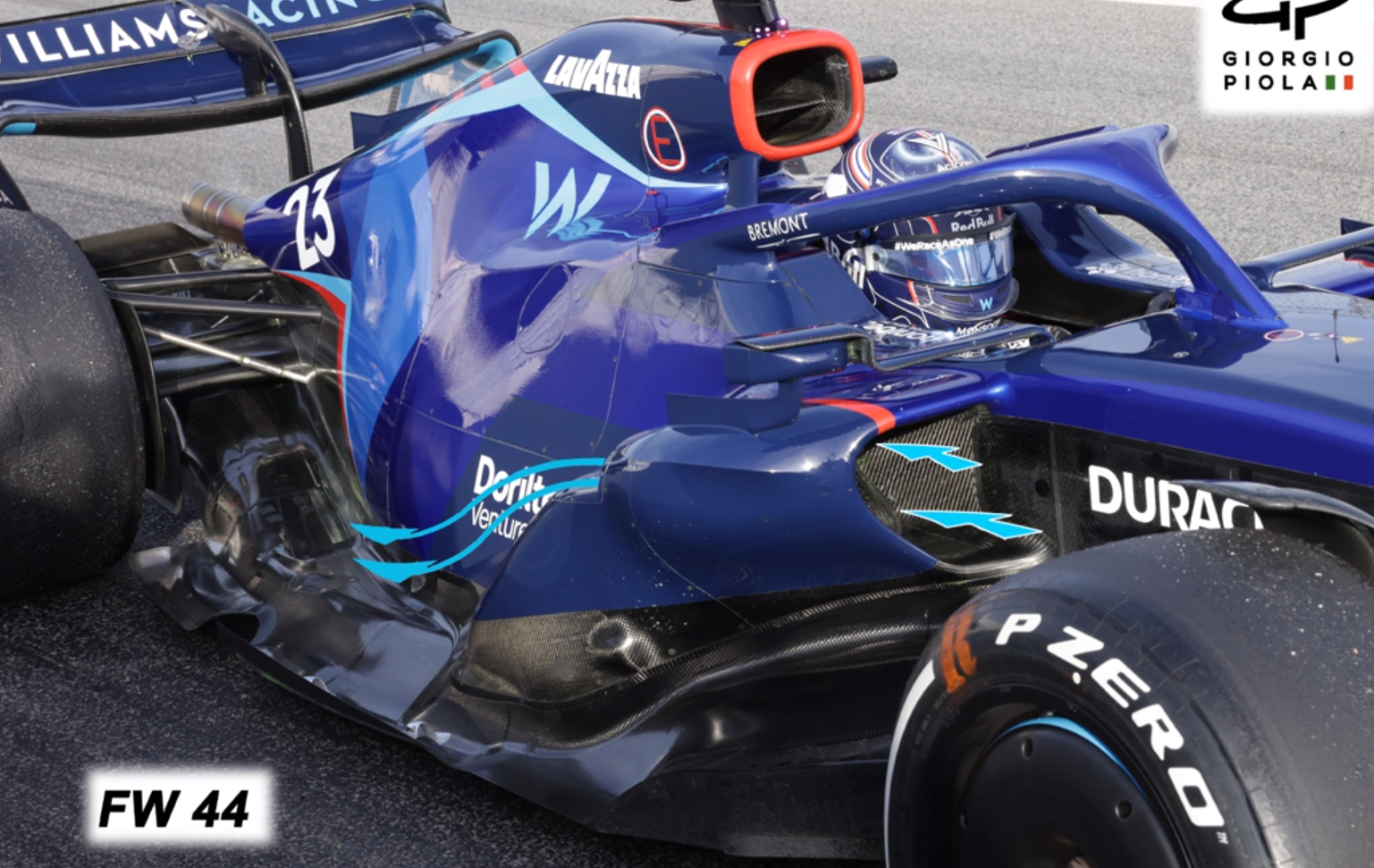 作为该设计的一部分,侧箱的整体宽度将取决于防撞梁。防撞梁的存在不容忽视,且在一定程度上需要变得更加公平。例如FW44的侧箱设计就采用上部防撞梁本身作为进气道的导流版,人为分割进入进气道的水平气流。