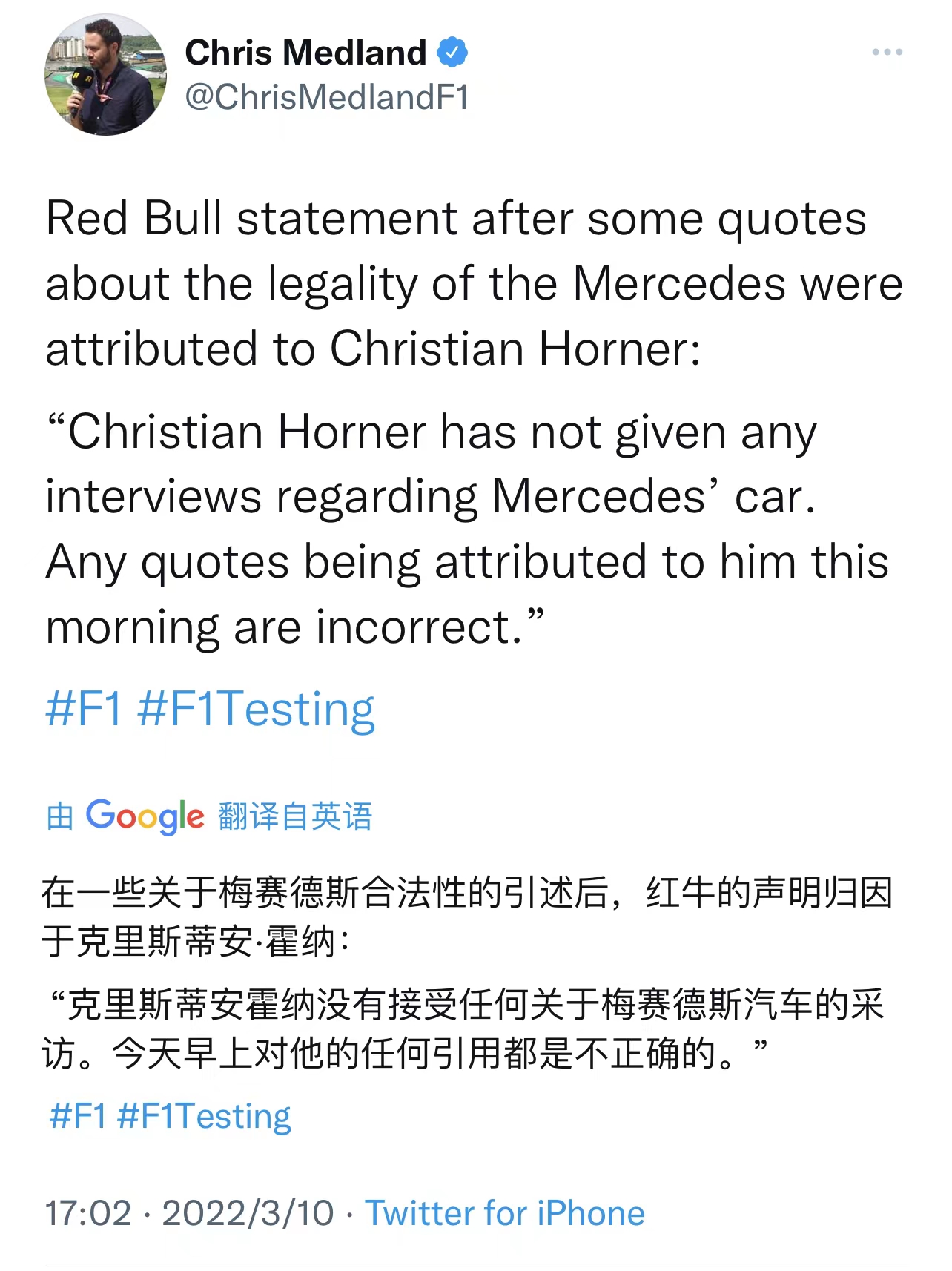 F1知名记者Chris Medland表示,红牛发表声明称克里斯蒂安·霍纳没有接受过任何关于梅赛德斯赛车的采访。今天上午关于霍纳认为W13违规的报道都是不正确的。