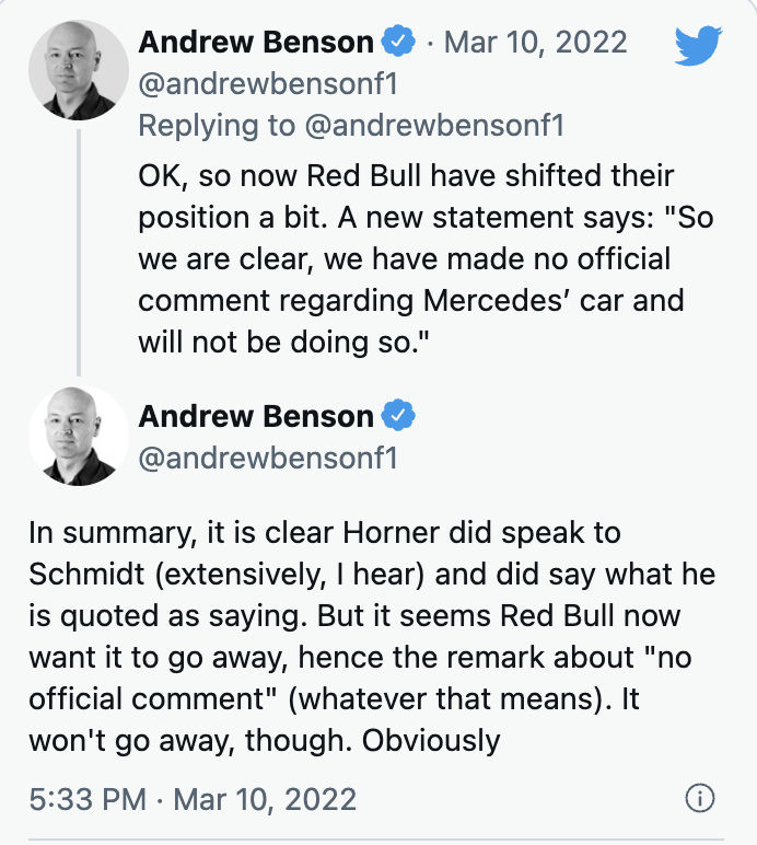根据BBC著名F1记者Andrew Benson的消息,多个可靠的消息源记者向他证实,霍纳确实说过W13的设计“太过分了”,“不符合新规的精神。对我们来说,这些设计是非法的。”