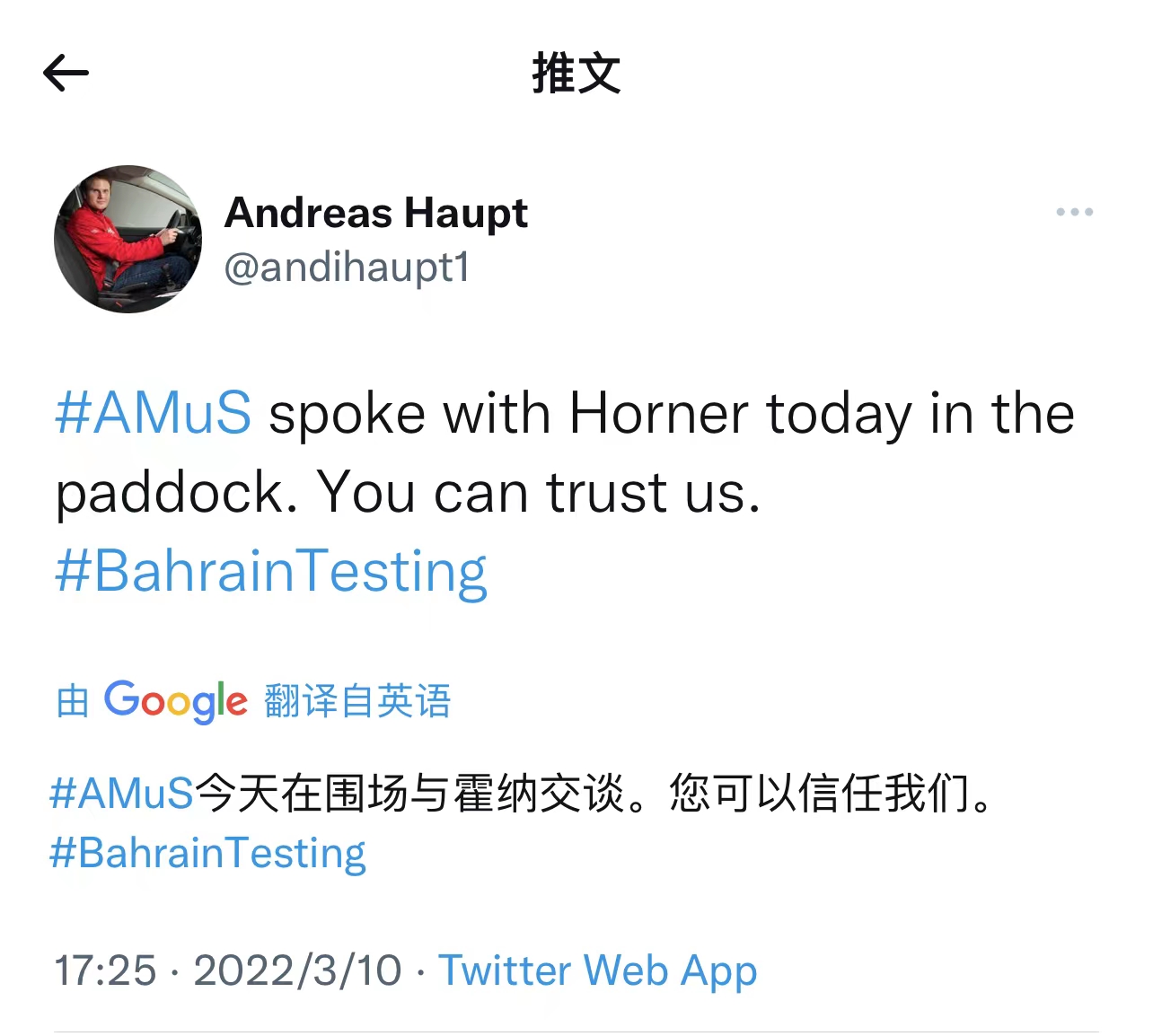 德国赛车媒体AMuS旗下的记者Andreas Haupt也发推强调自己确实与霍纳交谈过,这些话是真实的。