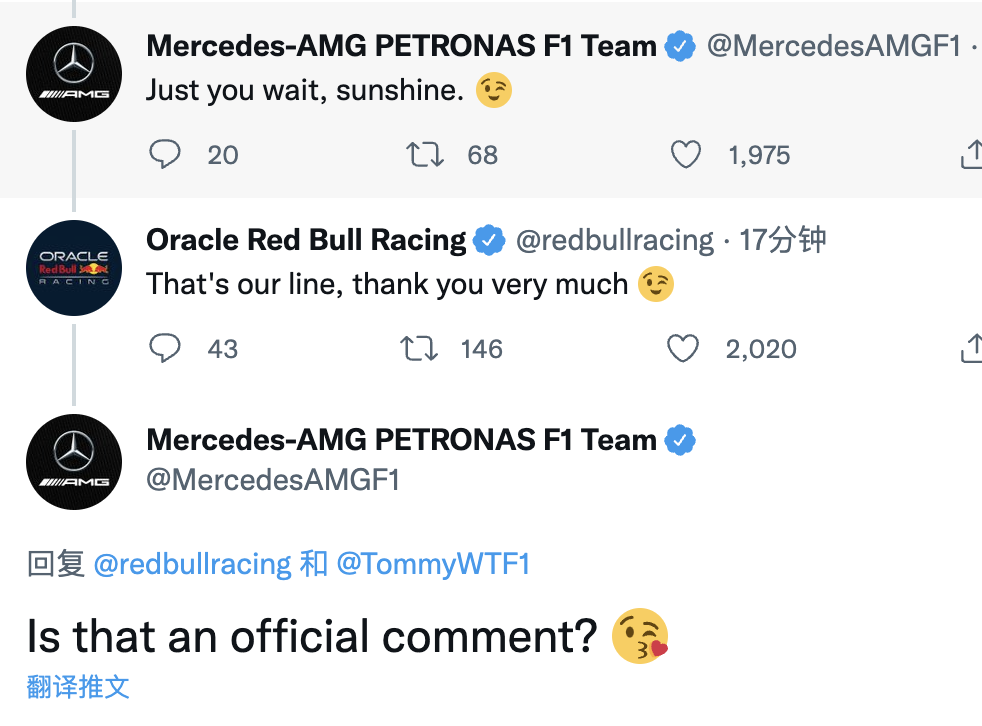 梅赛德斯回复车迷对拉塞尔车辆涂装的期待,说:“再等一下,宝贝”,红牛就评论道:“这是我们的台词哦,谢谢。”