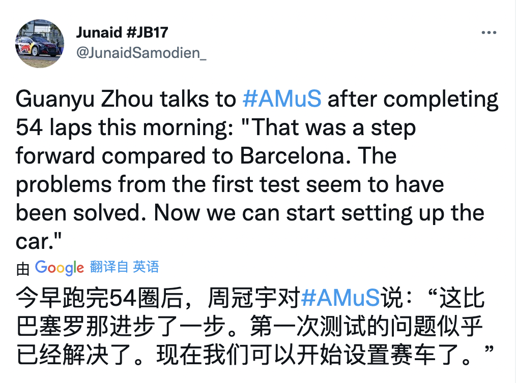 在比较顺利地结束了上午54圈的比赛之后,周冠宇接受了德国AMuS的采访。他表示,车队比巴塞罗那测试有了进步,第一次测试中的问题看起来已经解决了,车队现在可以尝试不同的设置。