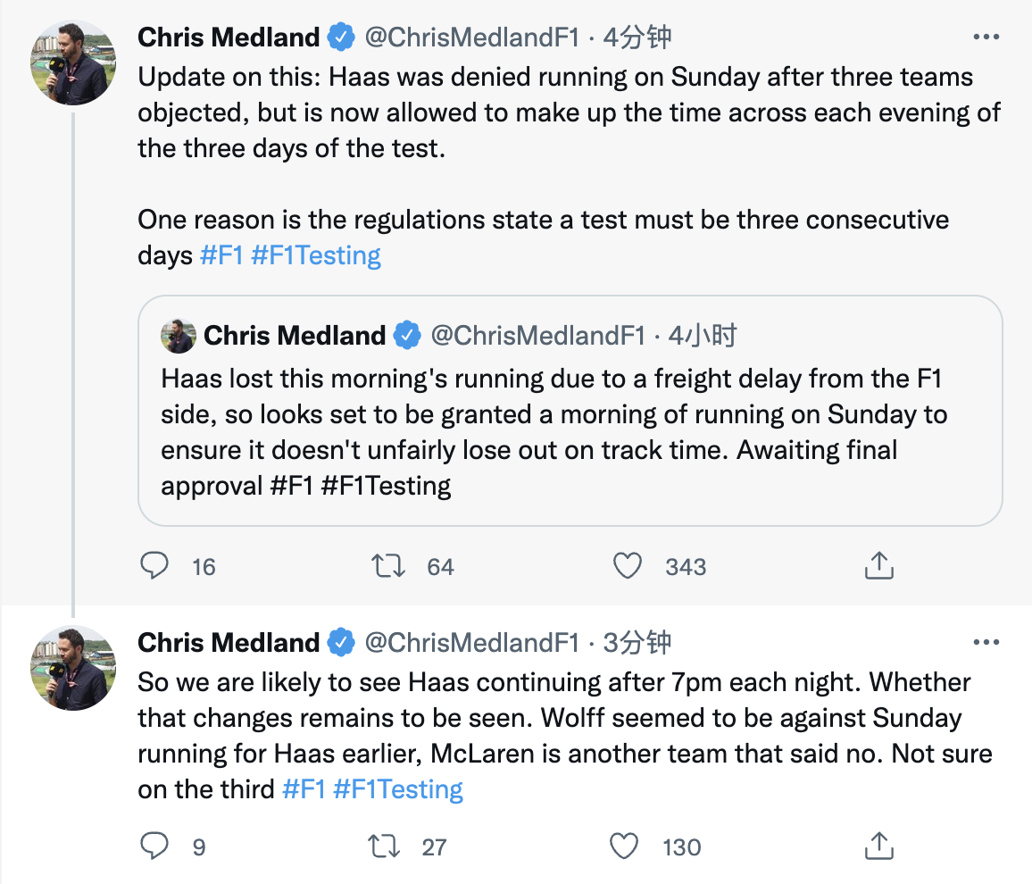 被三支车队(据报道包括梅赛德斯和迈凯伦)反对后,哈斯将不能在第四天(周日)上午弥补今天上半时的测试时长。