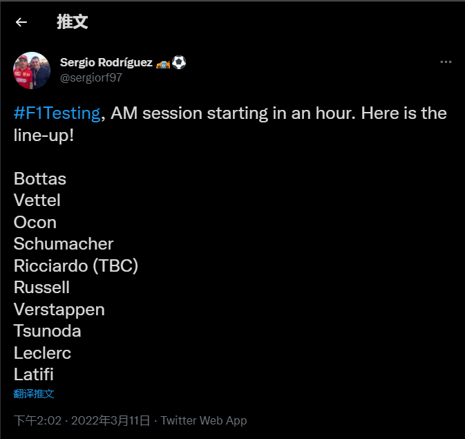 据@Sergio Rodriguez推特,今日上午场出场的车手将会是