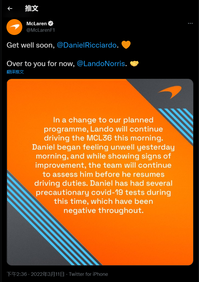 根据迈凯伦官方推特:我们暂定的计划再次被改变,今日将继续由诺里斯在上午场驾驶新车MCL36。丹尼尔从昨天上午便有不适症状,我们将在他可以驾驶赛车前继续评估他的症状。丹尼尔在几次新冠检测后并未出现异常。