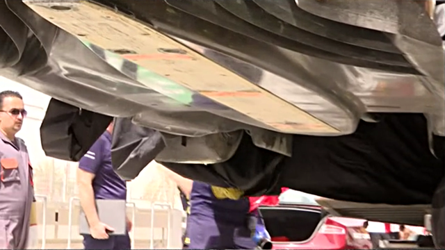 威廉姆斯车辆起火被吊上拖车的时候,车辆的底板被完全曝光。
