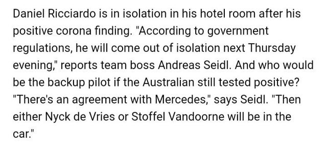 据德国AMuS报道,迈凯伦领队塞德尔表示,如果里卡多的新冠检测结果一直是阳性的话,他们跟梅赛德斯也有协议,可以使用梅赛德斯FE车手德弗里斯或者范多恩来成为里卡多的替补。