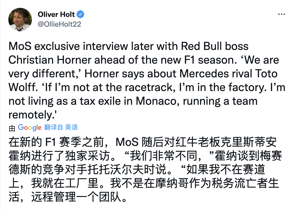 周日邮报采访霍纳时,红牛领队表示自己跟竞争对手沃尔夫完全不同。自己平时不是在赛道上就是在工厂里,而沃尔夫则在摩纳哥过着偷税漏税的生活,远程指挥车队。