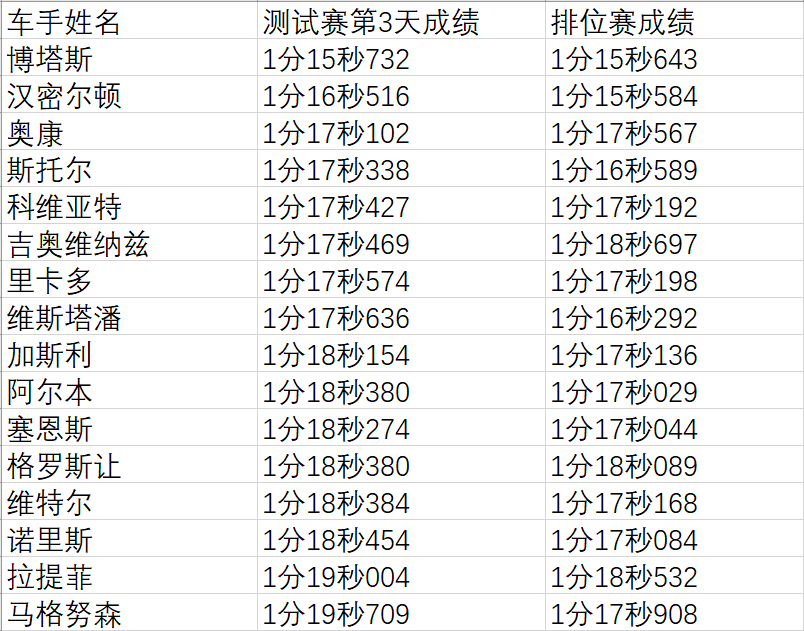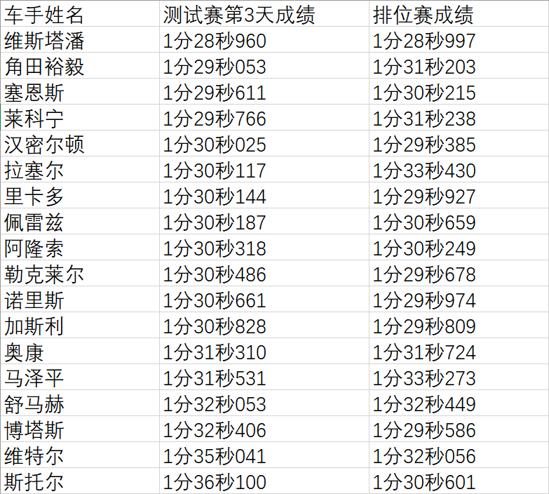 2020西班牙冬测第3天成绩及西班牙站排位赛成绩: