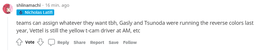 @shiinamachi:车队可以随便支配T架颜色吧,加斯利和角田去年就是反着的,维特尔今年在阿斯顿马丁还是黄T架。