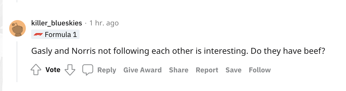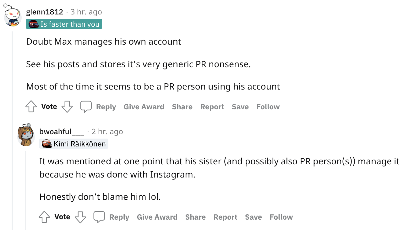 “维斯塔潘应该不是自己自己管账号吧,他的博文都很像PR的东西。看起来大多数时候都是PR在管他的账号。”