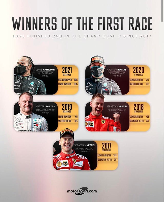 Motorsport发了这样一张图片,图片显示,自2017年起,每一年揭幕战的冠军都是当年车手总积分的第二名。
