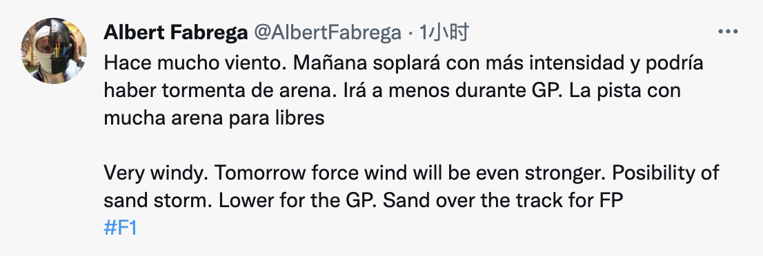 西班牙记者Albert Fabrega从巴林赛道现场带来报道:目前赛场上的风很大,明天的风力还会增强,甚至可能出现沙尘暴。在自由练习赛的时候,赛道上会有沙子。不过正赛时风力会减弱。