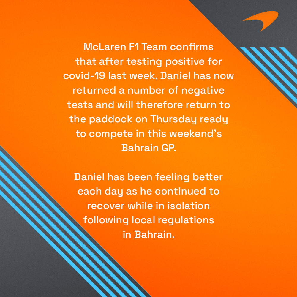 迈凯伦车队官宣,里卡多在近几次新冠检测中呈阴性,将于周四回到围场,准备参加揭幕战。