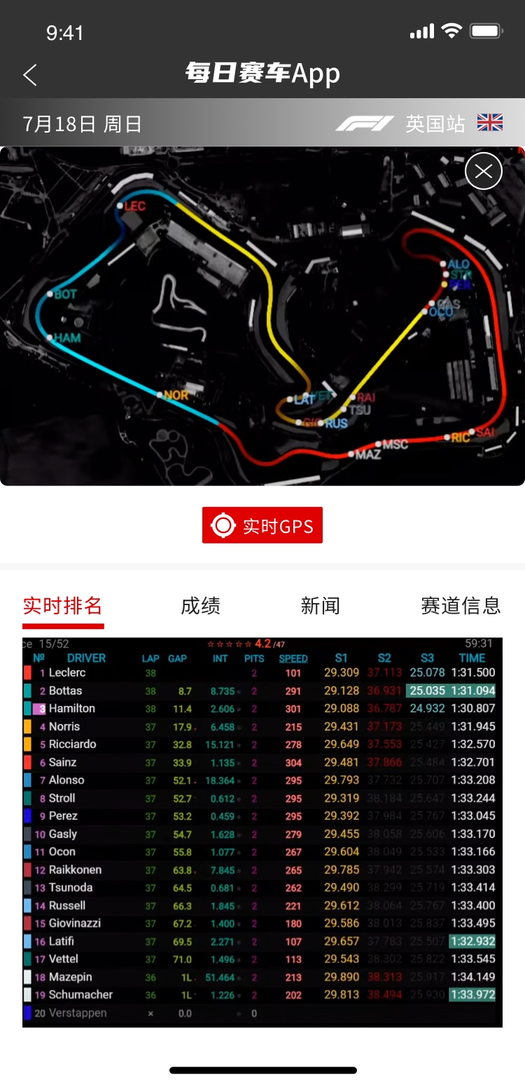 每日赛车APP将在周五晚上20点和23点,图文+实时数据直播F1巴林站练习赛。您只需将APP升级到最新版本,在直播期间从“比赛”标签里点击“查看详情”,即可观看“实时排名直播”和“实时GPS直播”。