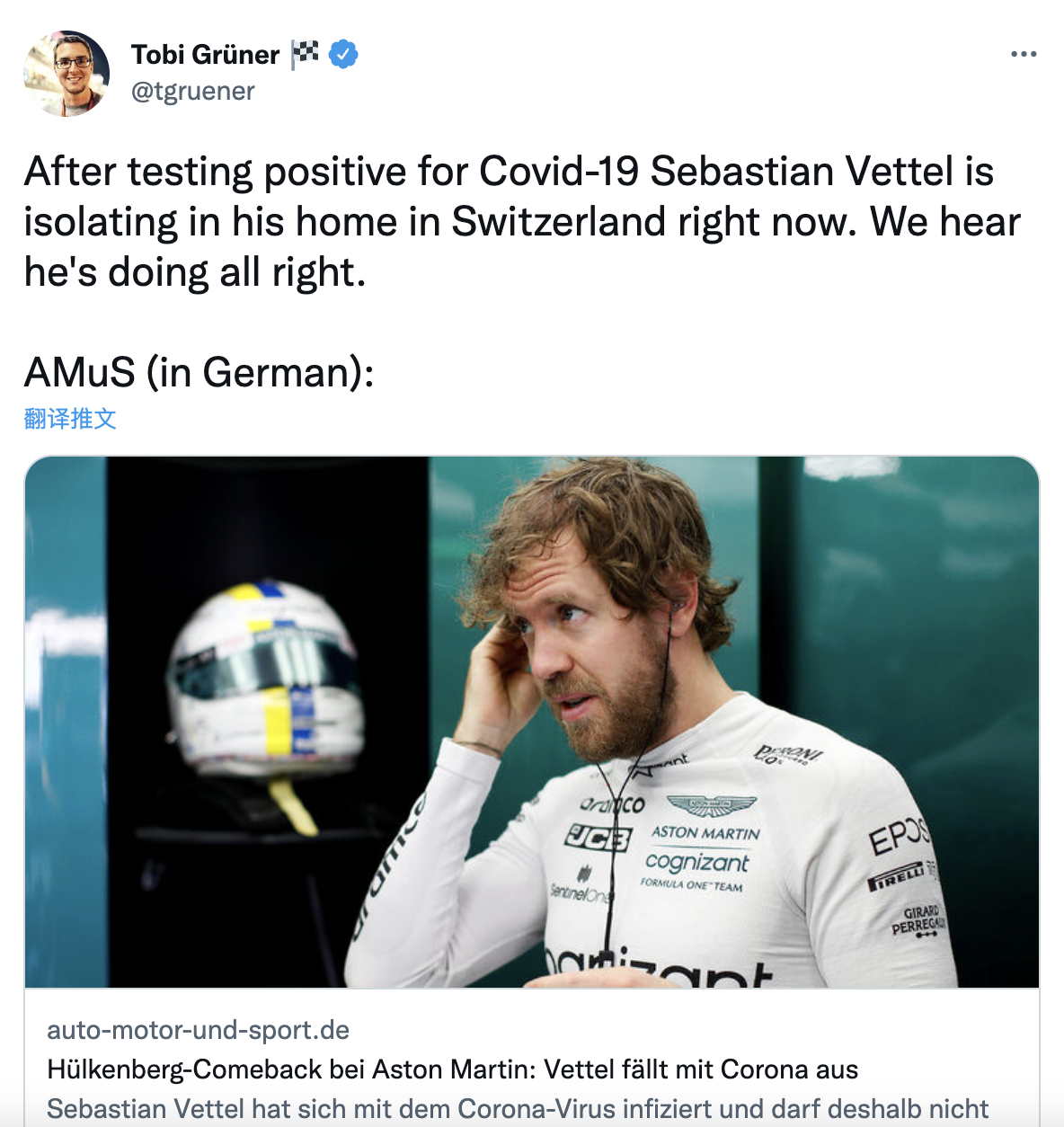 根据德国媒体AMuS报道,在确诊新冠阳性之后,维特尔目前正在自己瑞士的家中隔离。目前他应该状况良好。