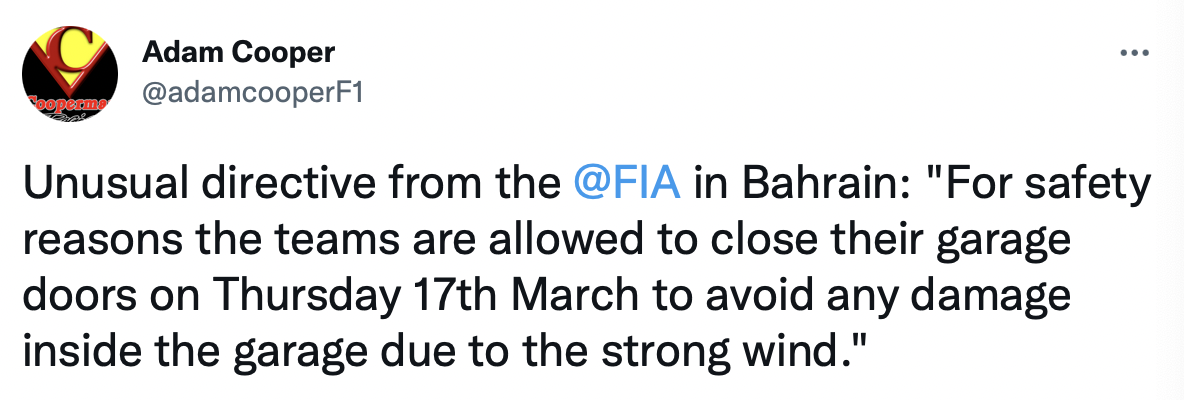 F1知名记者Adam Cooper在社交媒体上称,由于巴林当地的大风天气,FIA允许在当地时间17日将维修区车库门关闭,以防造成损坏。