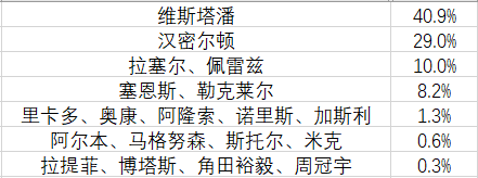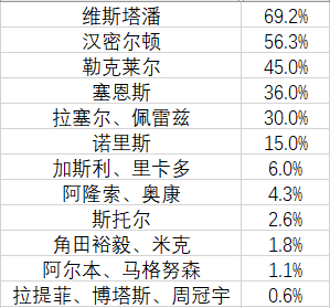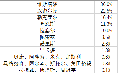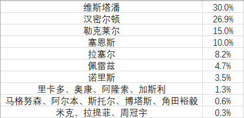 红牛和法拉利在测试中都表现强劲,两支车队的排名比较靠前,维斯塔潘夺冠几率最高,达到了30%,汉密尔顿排第二,也有26.9%,与维斯塔潘相差不大。