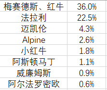 梅赛德斯和红牛车队概率相同,排在第一。他们也将面对其他车队的挑战。法拉利和迈凯伦的车手阵容都很合理。谁会拿到最多的积分呢?我们拭目以待。