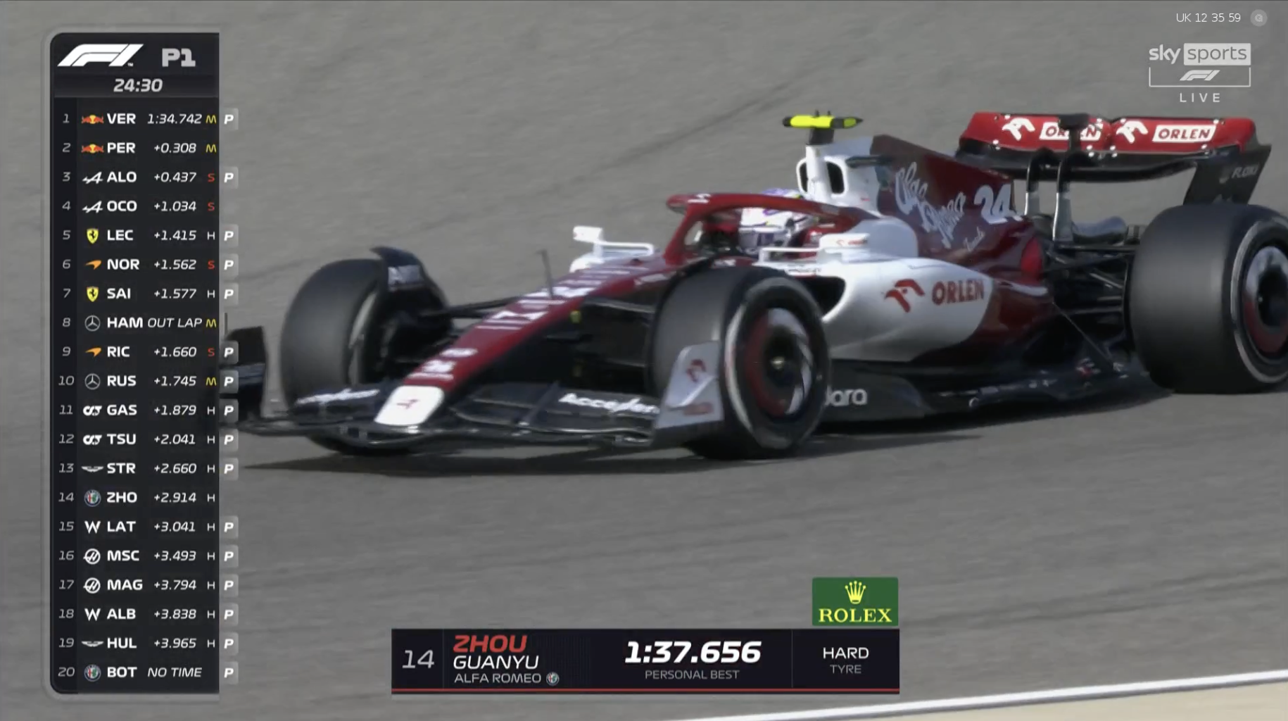 周冠宇首次驾驶阿尔法·罗密欧赛车出现在F1练习赛当中。